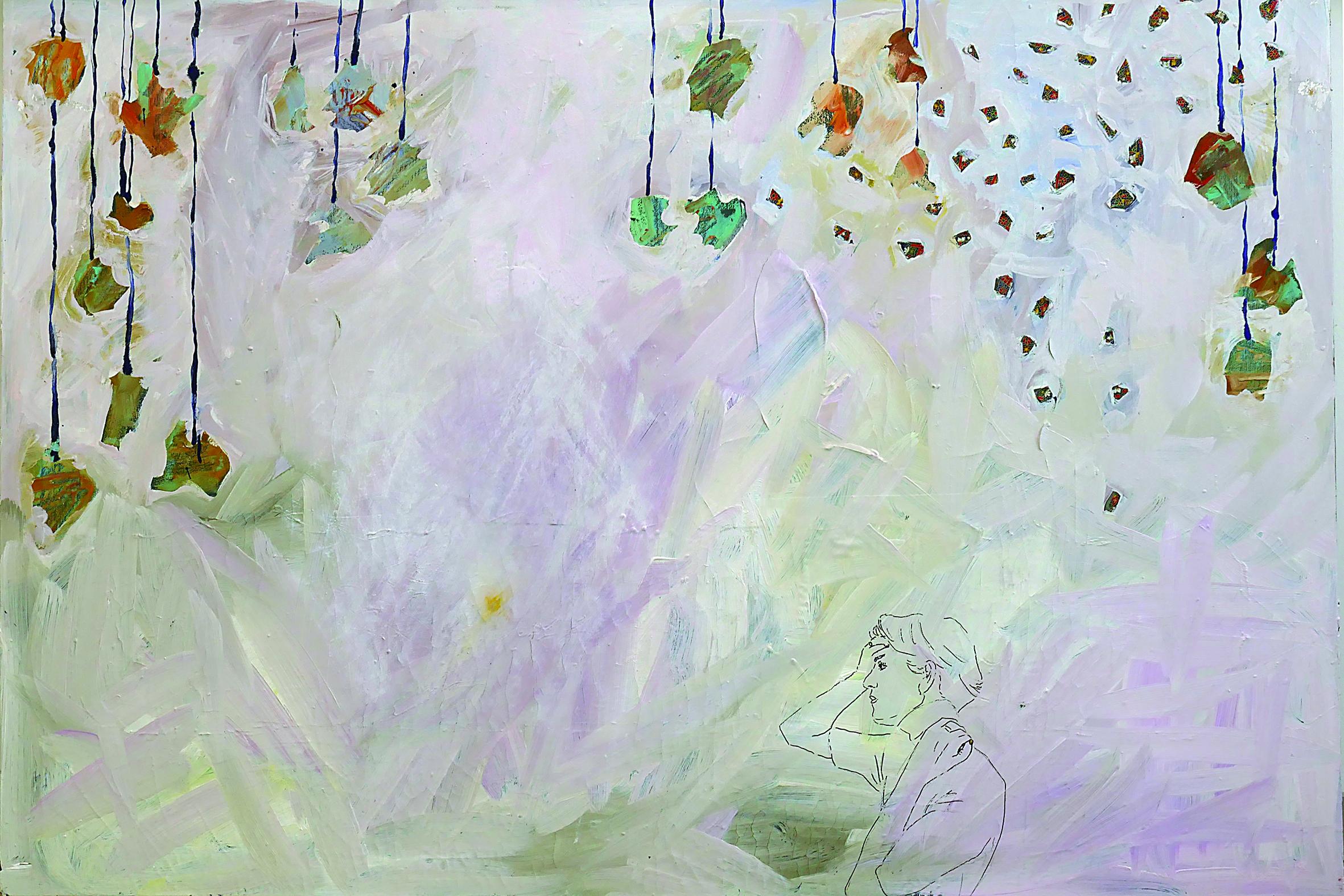 Dekorativen Elementen gleich schimmern, strahlen, drohen kräftige Farben durch die zartfarbig-milchige, doch auch dominante Bildfläche hindurch. Die großen scheinbar fixiert oder eher langsam abgesenkt an zittrigen Fäden? Die kleinen hingegen: Rieseln sie zerstörerisch herab oder durchdringen sie in suchendem Aufwärtsstreben die geordnet drückende Macht des Stabilen? Die Protagonistin des Bildes erträgt die Ambivalenzen nur mit Mühe. Ende offen.